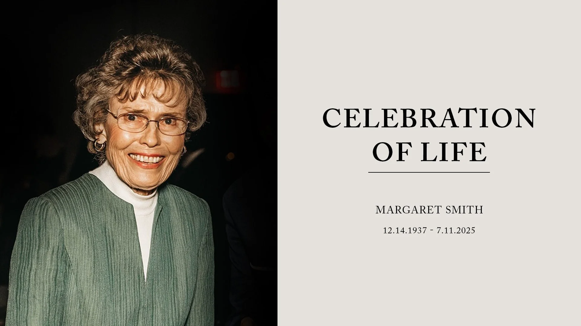 Thank you for joining us online, as we celebrate the life of Margaret Smith. The livestream will start on Saturday, November 22nd at 10am MST.